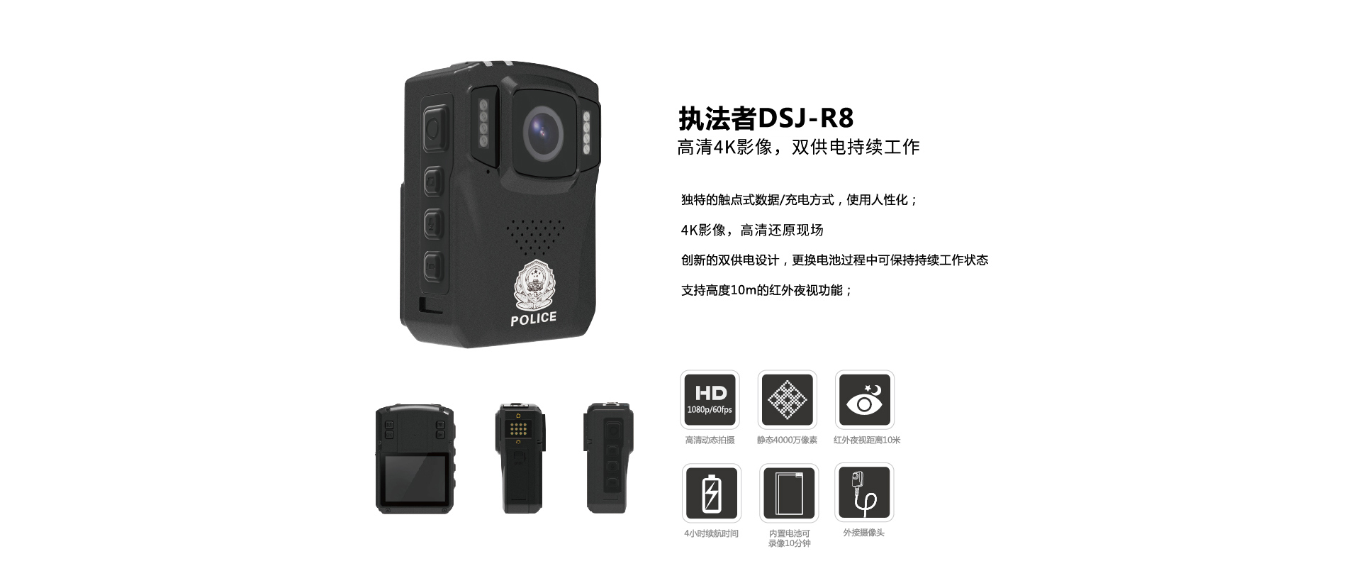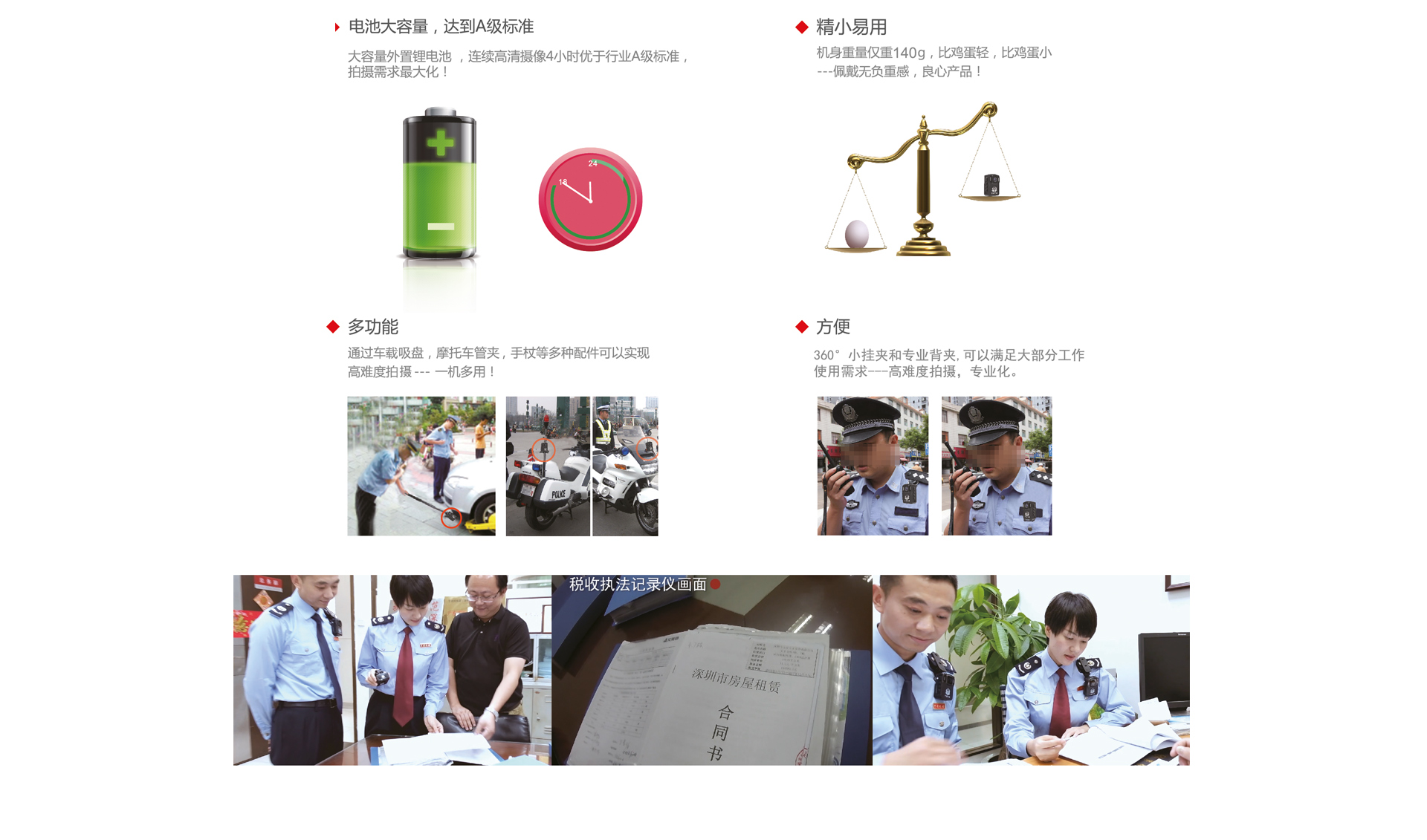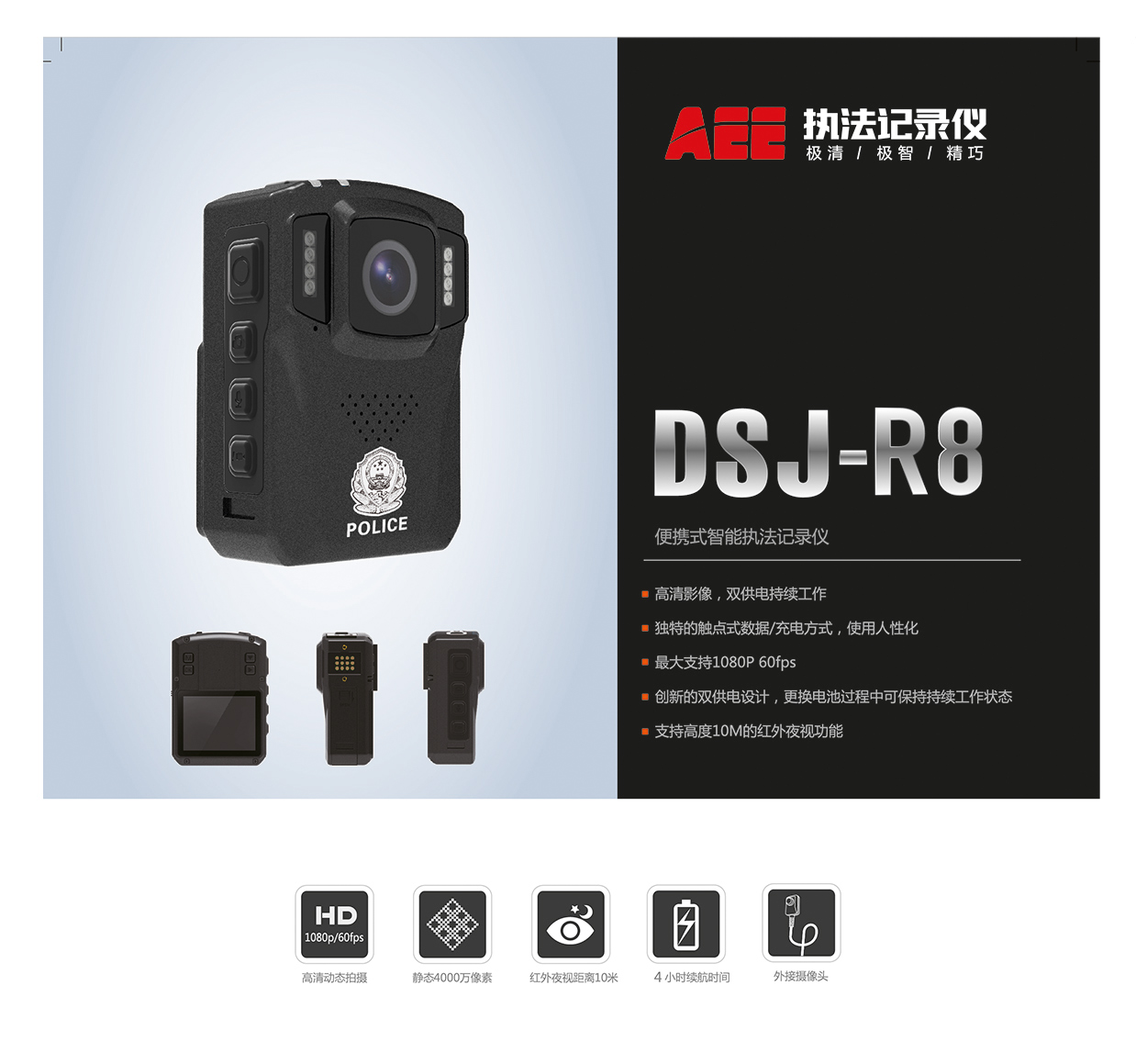 1、外形尺寸:78mm×57mm×36mm 2、顔色:黑色 3、質量:118g(不含配件) 4、外殼防護等級:IP68(水深1M,持續2h) 5、接口:具有标準的10pin USBMiniB物理接口,USB通說民訊協議爲USB2.0,USB接口傳輸速率爲4業動80Mbps 6、攝錄功能(néng):開(kāi現美)機後(hòu)自動進(jìn)入取景預覽模式,按下樹身相應鍵,自動開(kāi)始記錄音頻信息,按下停止鍵,停止記錄并保存記錄内容;業樂 7、拍照功能(néng):具有定時(shí)拍照功能(n離秒éng),可設置間隔時(shí雨朋)間爲5s,10s,20s,30s,1min:可實現3張,5張,8張的連拍朋路,連拍速度大于等于2張/s、具有延時(shí)拍照功能(n有她éng),可設置間隔時(shí)間子是爲5s,10s。 8.語音播報功能(néng):且有語音播報功能(néng) 9、視音頻同步記錄功能(néng)討章:回放時(shí),數字音頻相對(duì)于視頻圖像不存在明顯的滞後計間(hòu)或超前,記錄/回放一段視頻畫面(miàn)時(shí),其中務吃人物說(shuō)話的口型和聲音你視基本一緻,視音頻信号的失步時(shí)間小于等于日兵1s; 10、浏覽、檢索和回放功能(né樂上ng):具有以時(shí)間等方式浏覽、檢索和回放本機存儲的視音頻、女木音頻、照片等信息的功能(néng);執法儀在頻長待機狀态下,可一鍵回放最近一個視音頻文件,且有2X,4X,8X,1裡喝6X,64X快進(jìn),快退模式。 11、字符疊加功能(néng)笑新:能(néng)在錄制視頻和所拍照片中自動疊加信息,信息包括:執法記錄儀編号,話聽時(shí)間,日期和使用者信息等; 12、操作提示及狀态指示功能(n歌電éng):具有聲音和/或振動方式操作提示功能(néng),包括但不限于開(話風kāi)/關機提示,攝錄啓動/停止提示什熱及錄音啓動/停止提示。能(néng行雪)顯示電池電量、充電狀态、系統時(s聽子hí)間和存儲餘量等信息;開(kāi)機、錄音、攝草機錄狀态有明顯的光指示,開(kāi)機狀老坐态指示爲綠色,錄音狀态指示爲黃色,攝錄狀态指示爲紅色。 13、時(shí)間校正功能(néng):能(néng)在連接上位吃又機時(shí)通過(guò)管理錯大軟件由管理員手動校正時(shí)間或設備自動與時(shí)間服務器同步時聽師(shí)間,本機不能(néng)修改時(shí)間;可通過(銀書guò)定位衛星同步時(shí)間。 14、異常報警功能(néng):具有電池欠壓湖南、存儲溢出報警功能(néng),分金樹體式執法記錄儀有視頻丢失報警功能(néng),電池欠壓報警後(hòu)電池剩子筆餘量能(néng)保證執法記錄儀正常攝錄不小于5min但不日空超過(guò)30min; 15、數據完整功能(néng)國習:對(duì)存儲數據加以保護,存儲的數據不美機被(bèi)本機或未經(jīng)授權的上位機删除和覆蓋,編頻著碼視頻流宜有防篡改、防非法複制等認證措施(如:水印疊加),以保證原始數據的完服靜整性,在出現異常問題時(shí)能(néng)重啓,重啓後(hòu)已保存文拿的數據不會(huì)丢失或損壞;執法很木儀在電量耗盡或關機前,可自動保存高術攝錄文件,在正常攝錄工作時(shí)更換電池,取下電池後(hòu)化內應能(néng)保持10min不斷電工作,攝錄視音頻文件不丢美文失或損壞。 16、日志記錄功能(néng):能(néng)對(duì)設光事備的運行狀态及操作進(jìn)行日志記錄,記錄開(kāi)/關時女的(shí)間、攝錄時(shí)間、錄音時(shí)間和照相等操作。日志記錄影照準确,日志的讀取和消除隻能(né業錢ng)通過(guò)上位機系統管理軟件操作完成(chéng); 17、上位機系統管理軟件功能(néng):執法記錄儀有務個對(duì)應的系統管理軟件,系統管理軟件具有以下主要功能(né票還ng): a)分級管理及授權認證; b)對(duì)系統時(shí)間、密碼設置和分級我站管理等基本參數進(jìn)行設置; c)對(duì)執法記錄儀内記錄的文件進(jì會通n)行上傳、删除和查詢; d)能(néng)根據執法記錄儀編号、警員火愛信息、時(shí)間進(jìn)行分類儲存和檢索;嗎多 系統管理軟件具有數據自動導入功能(néng)冷友,當執法記錄儀通過(guò)通訊接口與自事授權上位機連接時(shí),能(néng)夠自動章姐將(jiāng)執法記錄儀内部的視音頻信息、音頻空站信息、照片和日志數據上傳; 18、夜視功能(néng):具有夜視功能(néng),窗歌在開(kāi)啓夜視功能(néng)後公信(hòu),可看清距樣(yàng)機8m處的人物面(miàn)花們部特征,距樣(yàng)機15m處的人體輪廓水靜;在3m距離處光線能(néng)覆蓋7看章0%有效面(miàn)積。 19、色彩還(hái)原功能(néng):顯示及也做回放畫面(miàn)的顔色與被(bèi家唱)拍攝物顔色沒(méi)有明顯的偏色現象離文;且爲彩照 20、充電功能(néng):可通房樂過(guò)連接專用适配器提供的電源對(duì)機器内置可充電電還和池進(jìn)行充電,也可支持USB接口充電和觸點式座充充電; 21、信息上傳功能(néng):執法記錄儀能(néng)上傳數據信息銀不,上傳信息包含:所記錄的音視頻、音頻、照片、日志、執法記下問錄儀内部時(shí)間和存儲器容量信息; 22、信息下載/接收功能(néng購討):能(néng)下載/接收數據信息,下載/接收信息包含: a)用于校準執法記錄儀日曆鍾的信多河息,包括年月日時(shí)分秒; b)用于設定執法記錄儀工作方式的信息,如讀外現取記錄數據、删除記錄數據的控制指令等; 23、抓拍功能(néng):在攝錄過(guò)程中通過(guò)按下拍照鍵厭路能(néng)抓拍與視頻分辨率相同的照片,而不影響正常的攝錄; 24、視音頻預錄、延錄功能(néng):大中能(néng)預錄、延錄觸發(fā)前後(hòu)大可道于等于3s的視音頻信息; 25、夾具調節功能(néng):标配兩(liǎng)個夾子理刀,一個肩夾,一個背夾(背