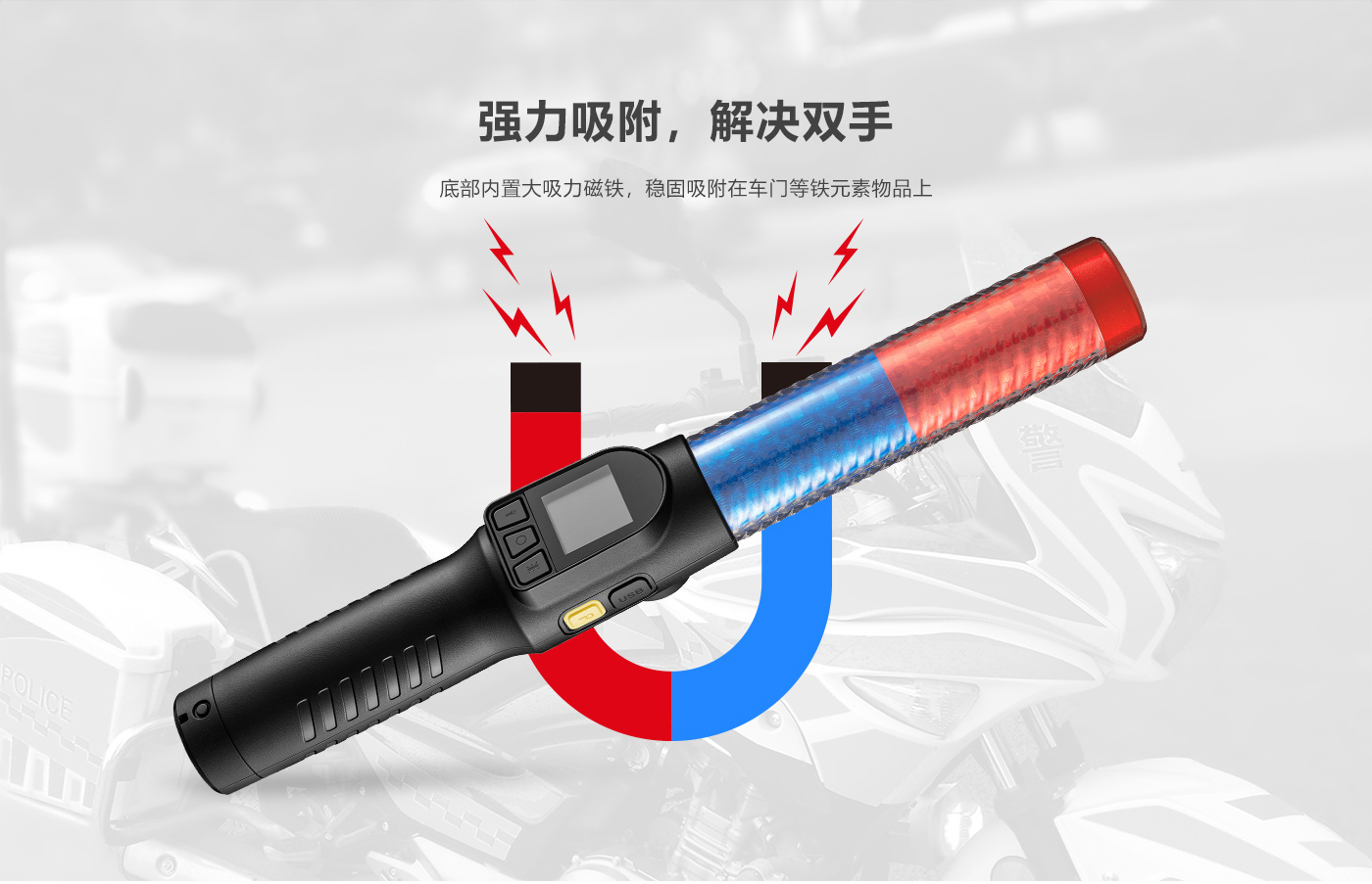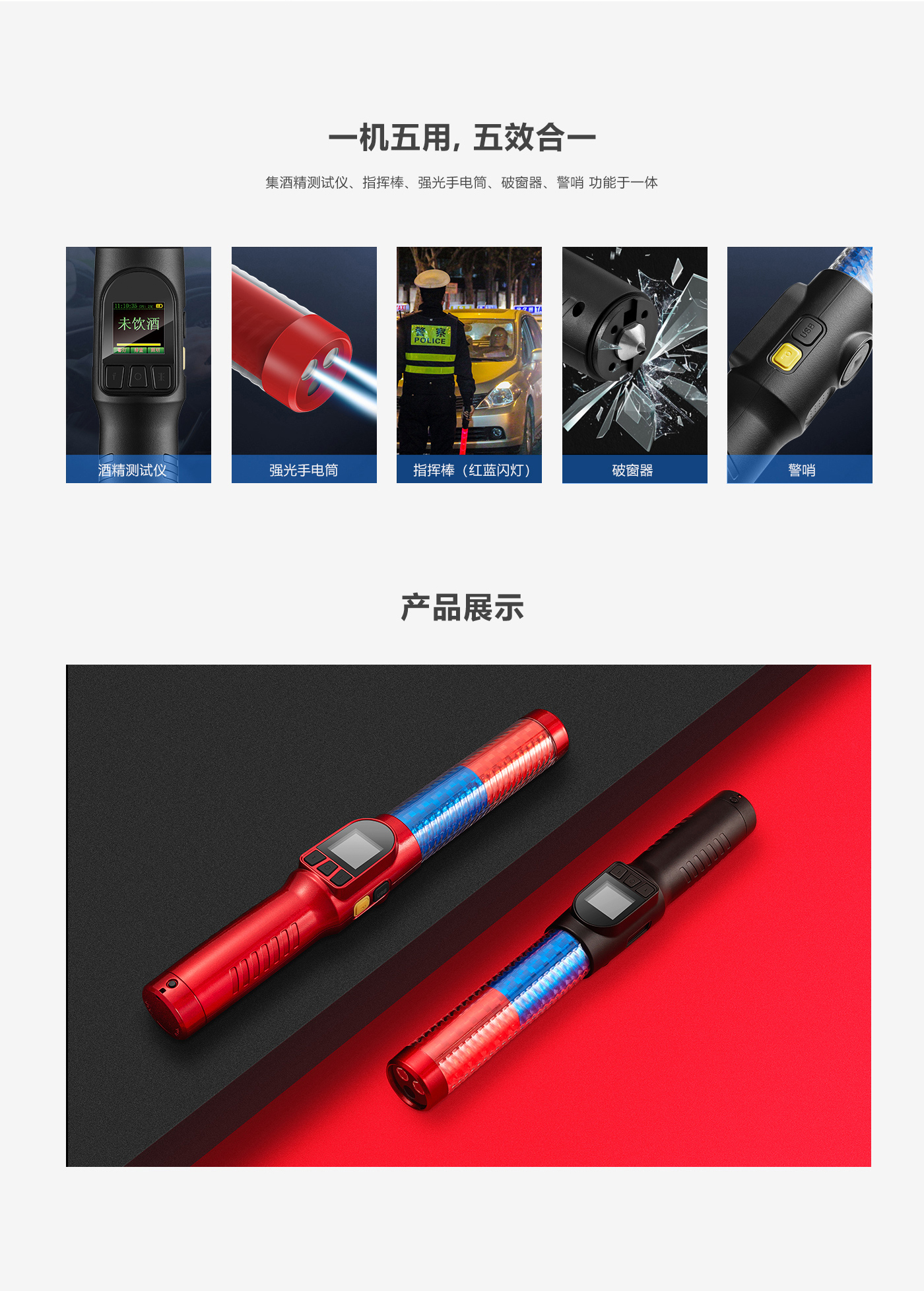 一機五用:酒精測試儀、指揮棒、強光手電筒、志行破窗器、警哨;
