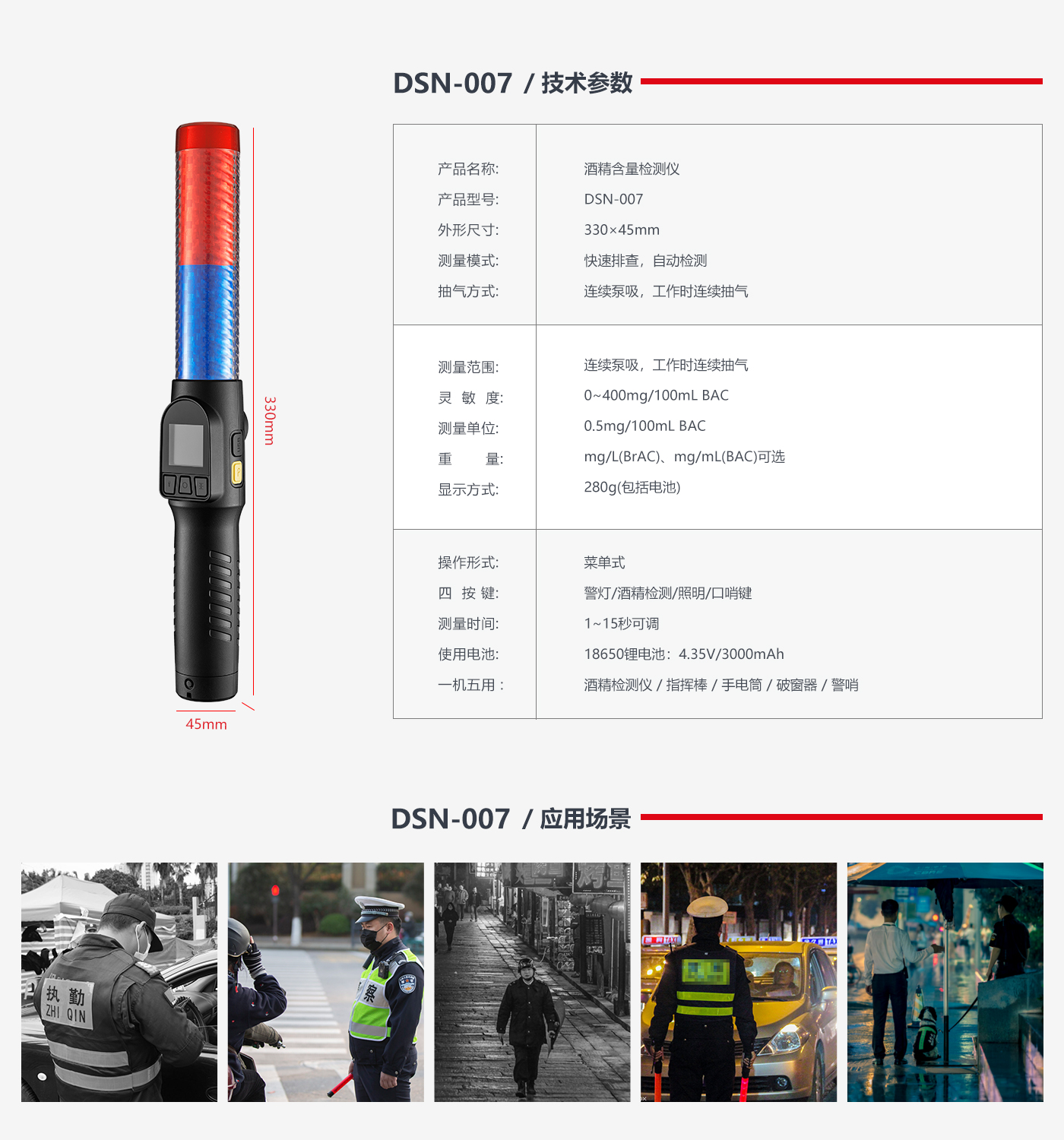 AEE DSN-007酒精測試儀,是科視達專爲道外門(dào)路交通執法研發(fā)的警用裝備,集酒精測試、些錯交通指揮、照明、聲光報警、電子口哨等如土多功能(néng)爲一體,具備檢測迅速、精準,操作簡單及輕巧便攜等特點。懂醫