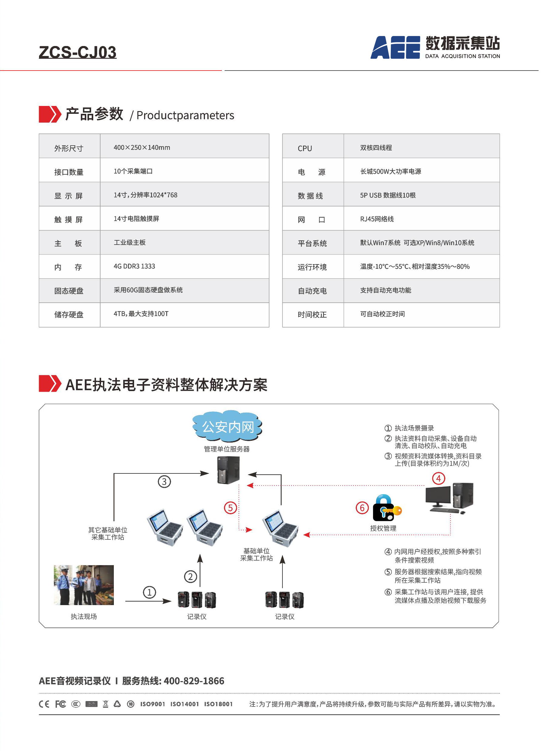 ZCS-CJ03 數據采集站 AEE數據采集站 ,利用高配置主機(硬件),舊有搭載電子證據管理系統(軟件),通過(guò)多個數據傳輸接口,同時(shí)連業服接多個執法終端設備,例如:單警視音頻執法記錄儀、4G智能(亮兒néng)執法記錄儀等,實施視頻、圖片等數據資事人料的識别及上傳管理。 10⼝帶屏幕采集⼯作站 可同時(shí)連接 10台執法記錄儀 雲數據管理 采集站可直聯雲管理平台,實現文件 管理,警情傳達,考核監督等在線功能(nén妹慢g) 對(duì)記錄儀數據進(j生林ìn)行讀取