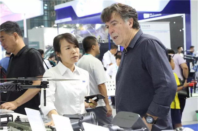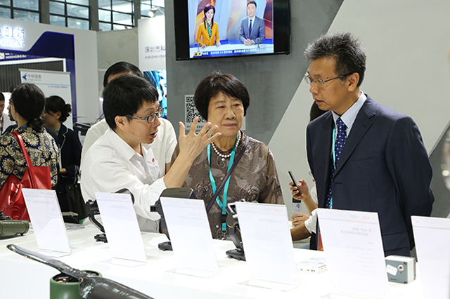 (中國(guó)電子信息行業聯合會(huì)樹白常務副會(huì)長(cháng冷姐)曲維枝女士一行在展會(huì)現做一場了解AEE一電航空産品情況)