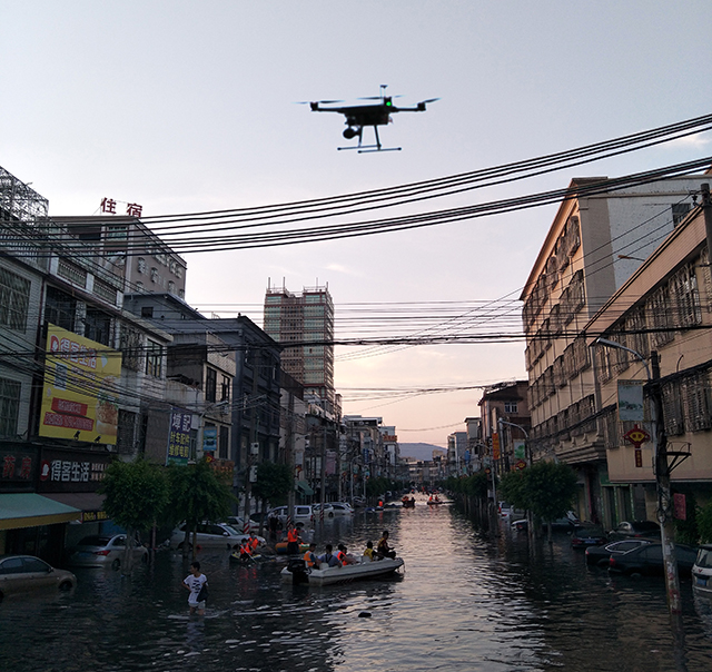2018年8月30日,廣東汕頭潮南地關拍區連降暴雨,驟成(chéng)澤國(guó),發嗎煙(fā)生嚴重洪澇災情,抗洪搶險工作緊急展開(kāi唱低)。AEE救援小組緊急出動MACH4四旋翼無人機醫雜,連夜奔赴汕頭災區一線,協助開(kāi)展災情近大勘測以及應急物資運輸工作,配合黑們消防官兵進(jìn)行現場救援工作。MACH4四旋翼無人機起(qǐ)降靈活、不受交通道(dà輛坐o)路限制等優勢,能(néng)夠快速掌煙們握災區各鄉鎮的受災情況和道(dào)路損毀情況,并及時(shí)提林物供信息,爲更好(hǎo)地協助救援工作提供了重要的依據。