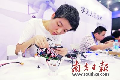 深圳國(guó)際無人機展覽會(huì)上,無樹技人機組裝大賽的選手正在組裝無人機。魯力 攝