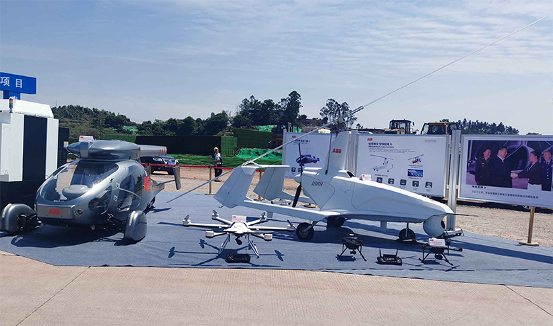 動工現場展示的多旋翼無人機、自轉旋翼大載荷無人機和未來出行共軸雙唱路槳飛行汽車。